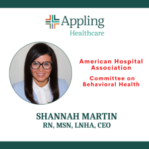 We are proud to share that Appling Healthcare CEO Shannah Martin has been appointed to serve on the American Hospital Association’s Committee on Behavioral Health.